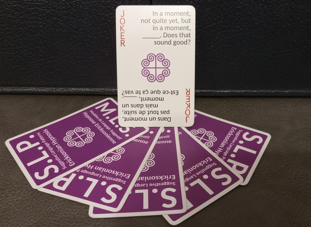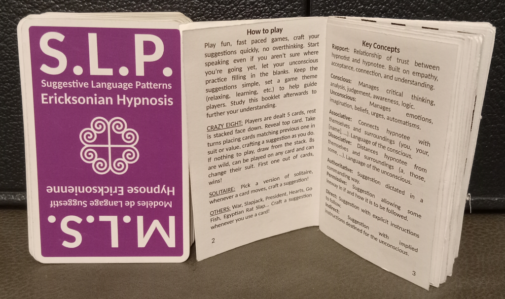 Each card features a fill-in-the-blank phrase based on 18 Ericksonian suggestive language patterns. Incorporate them in your speech while playing with friends and become a master in no time!